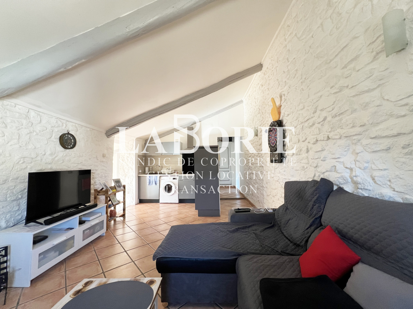 Côté charme, murs en pierres et poutres apparentes dans la pièce de vie.