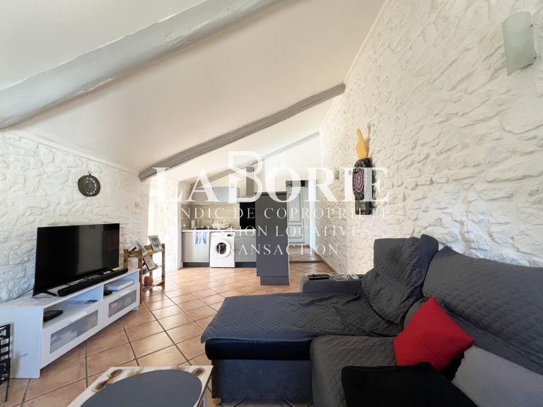 - Une pièce de vie lumineuse avec sa cuisine aménagée.