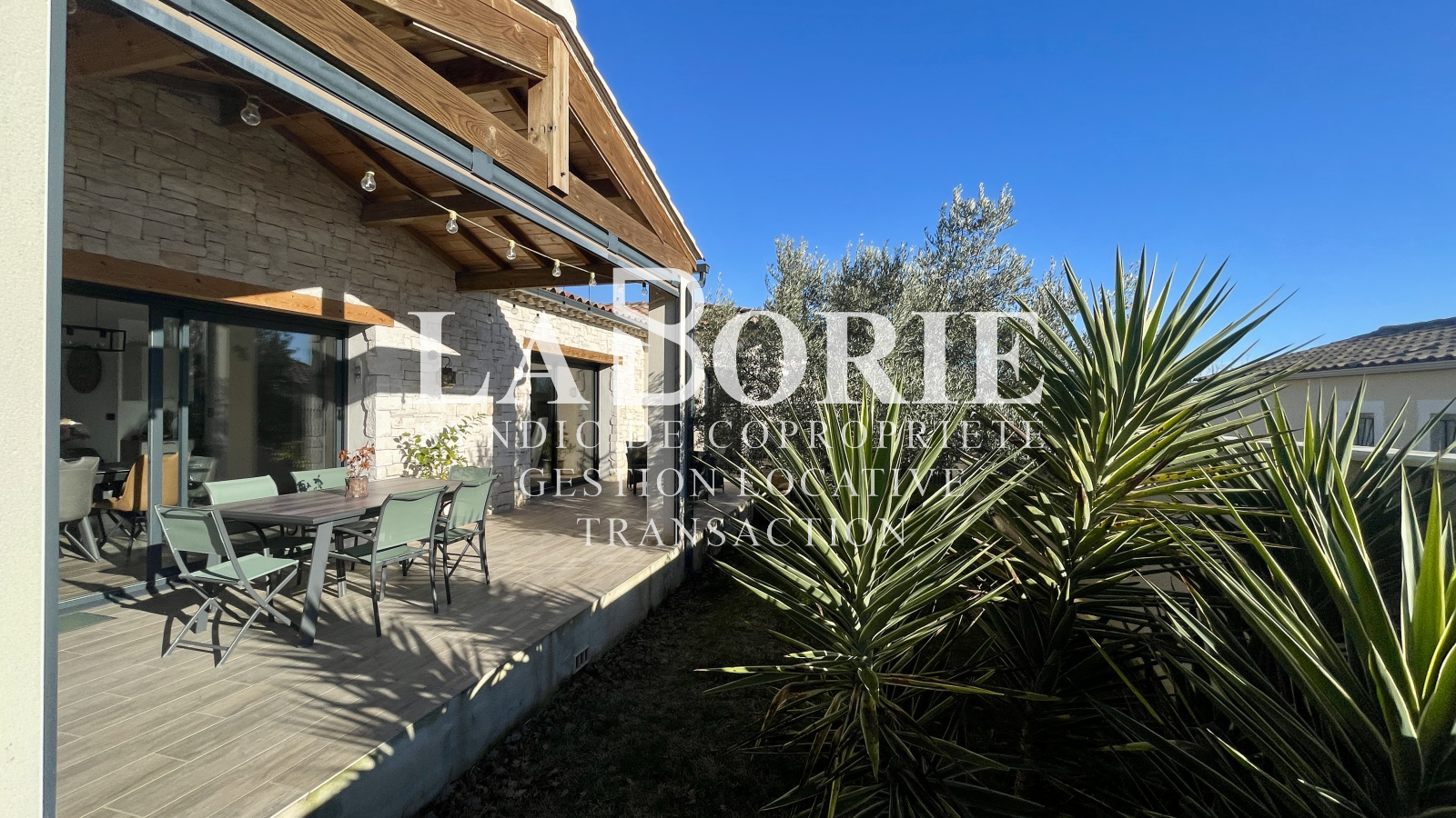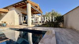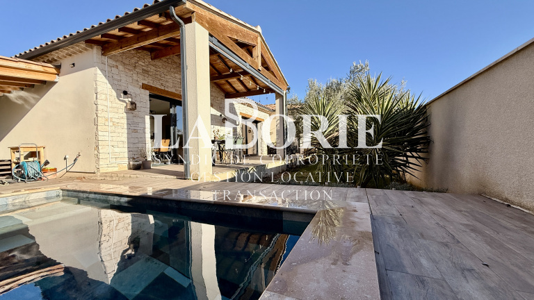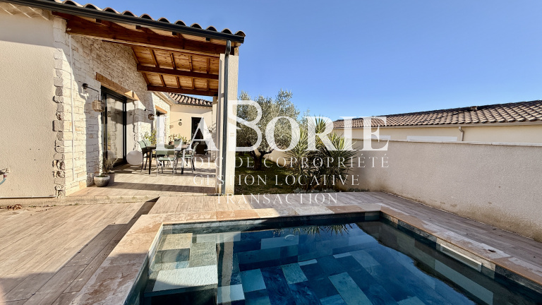 À l’extérieur : jardin intimiste sans vis-à-vis avec oliviers, grande terrasse, piscine 4x3 en pierres de Bali, garage, carport, terrain clos avec portail automatique.