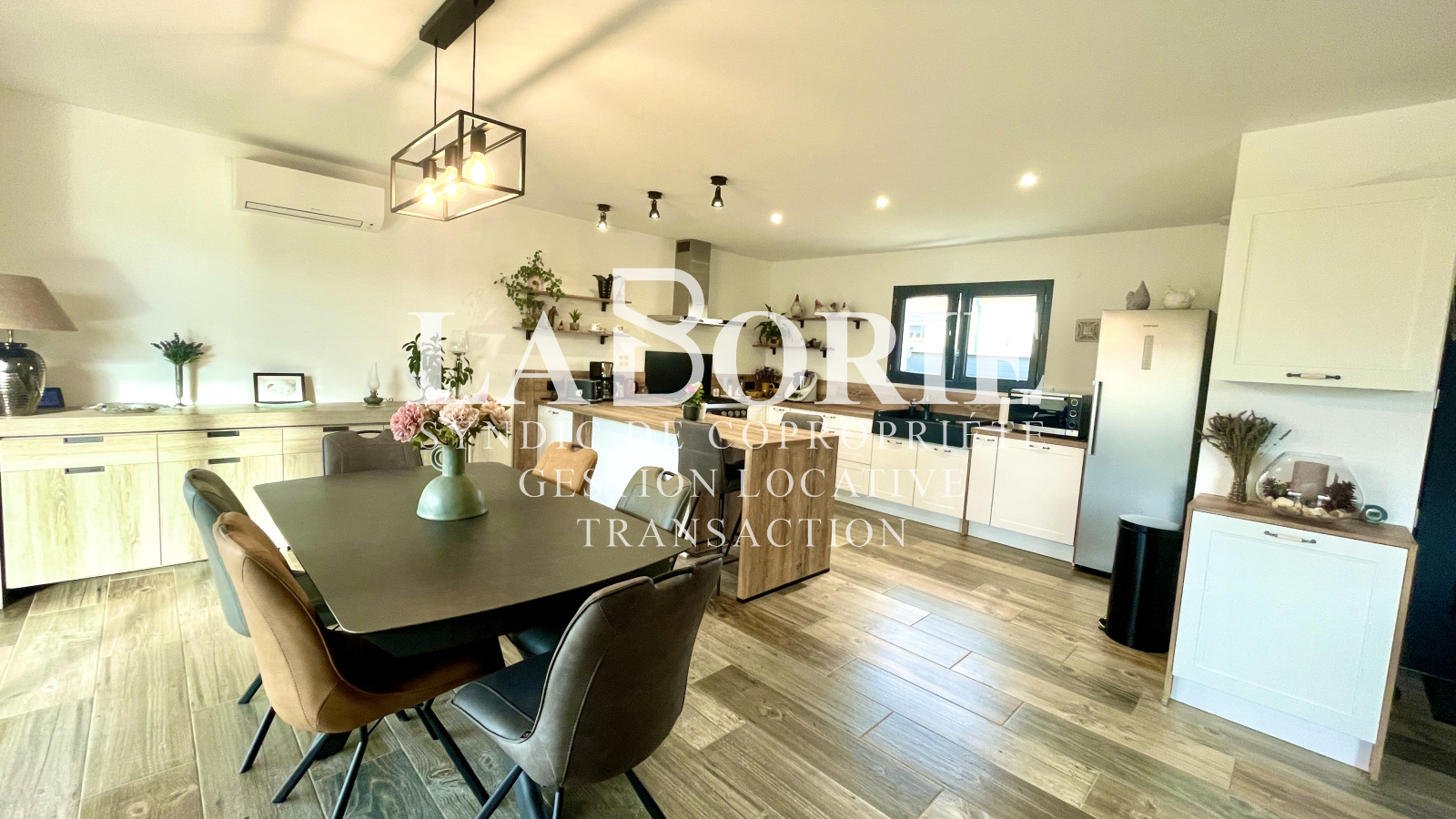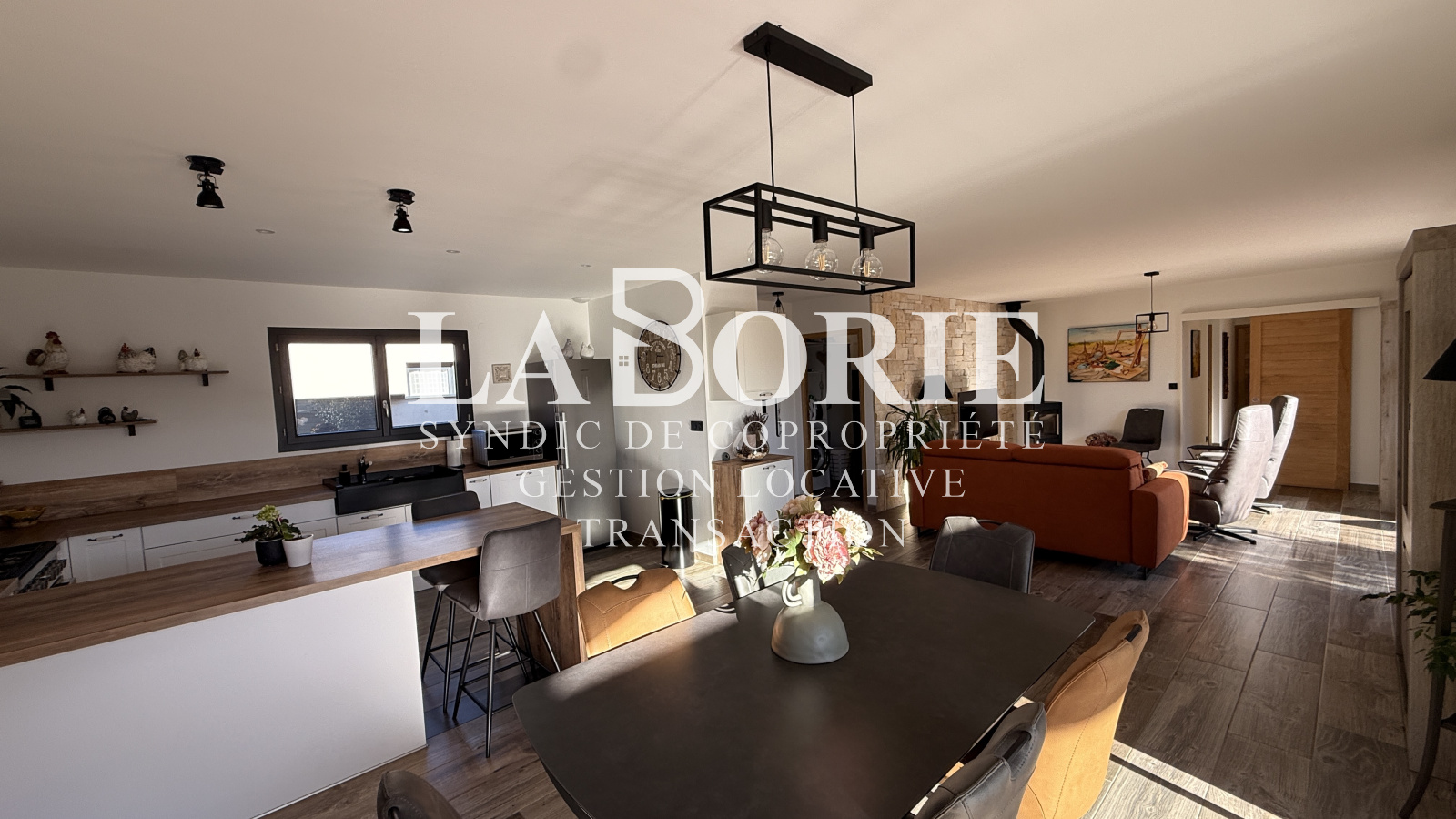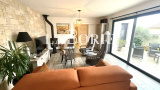 Elle offre une belle pièce de vie lumineuse avec cuisine ouverte, salon avec poêle à bois, 3 chambres dont une suite parentale avec salle d’eau et dressing, une seconde salle d’eau, WC indépendants et buanderie. Confort moderne, belles finitions, climatisation réversible